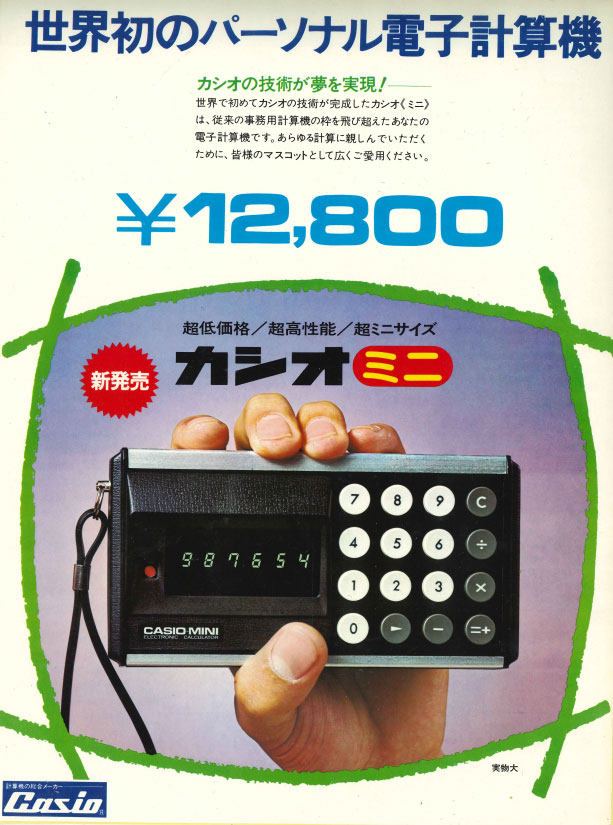 Casio Mini:1972年发布。Casio Mini采用纤薄轻巧的机身,便于携带。降低消费者成本是开发的主要重点,该型号实现了12,800日元的价格,降至当时普通计算器价格的三分之一。该产品大获成功,在短短10个月内售出100万台,总销量达到1000万台。Casio Mini使得卡西欧品牌与计算器联系在一起。在计算器一度仅限企业使用的市场环境下,Casio Mini为计算器进入普通家庭铺平了道路。随着Casio Mini引领的广泛普及,LSI技术需要大量生产,从而推动了计算器和LSI技术的并行发展。