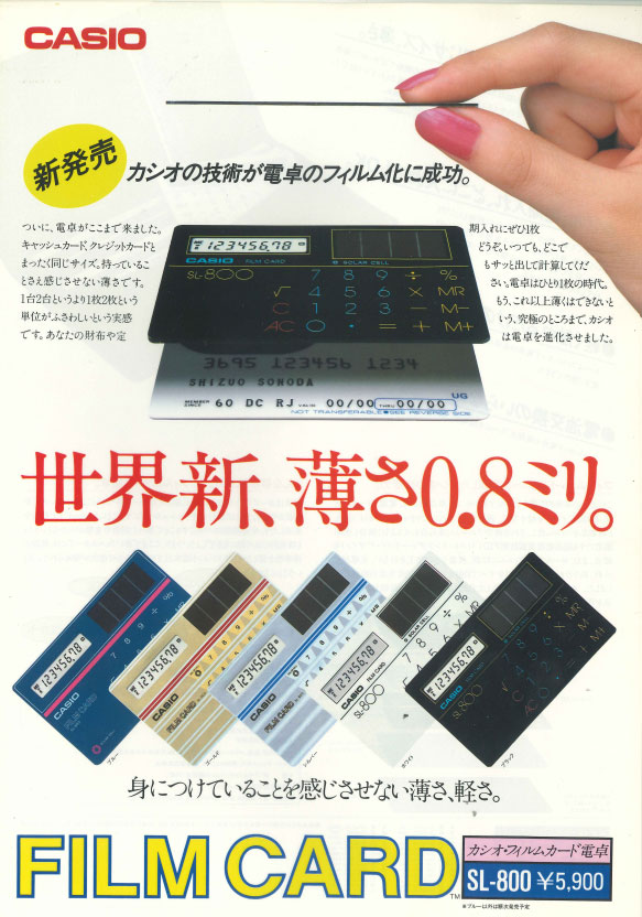 SL-800:1983年发布。采用类似薄膜的电子元件处理方式,SL-800实现了仅0.8毫米的厚度和12克的重量,成为当时世界上最薄的信用卡大小计算器。该型号融合了日本的想象力和技术实力,被认为是便携式计算器的终极形态。
