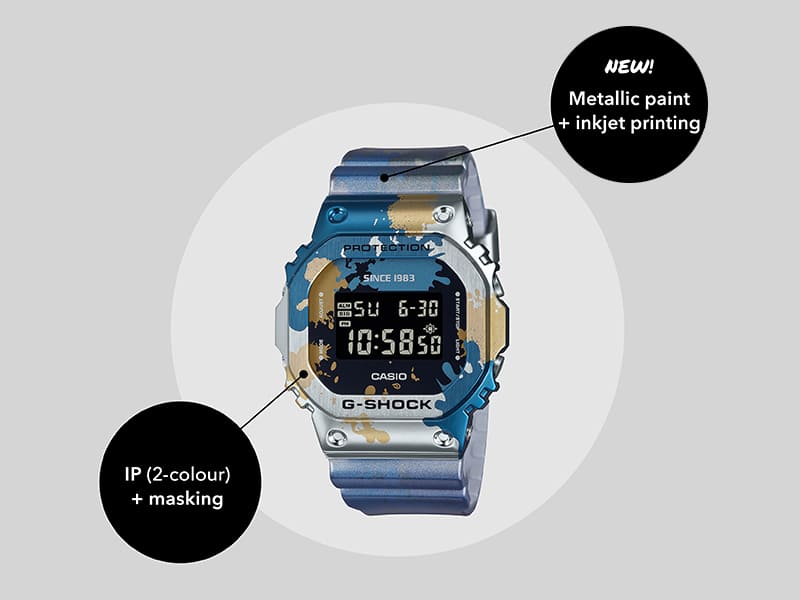 在每个组件上采用不同的技术,再现涂鸦艺术中的喷涂效果。反复遮蔽工艺和色彩丰富的离子镀层打造了一种蓝金两色重叠溅射的创新图案设计,同时又突显了金属表圈的银色底色。表盘上同样印有与之相匹配的图案。树脂表带上饰有金属涂层和喷墨印花。手表整体设计体现了街头“涂鸦艺术”的风格,金属纹理和喷涂效果尽显个性风采。