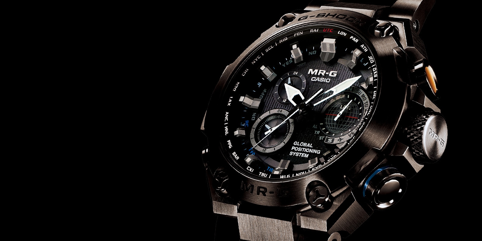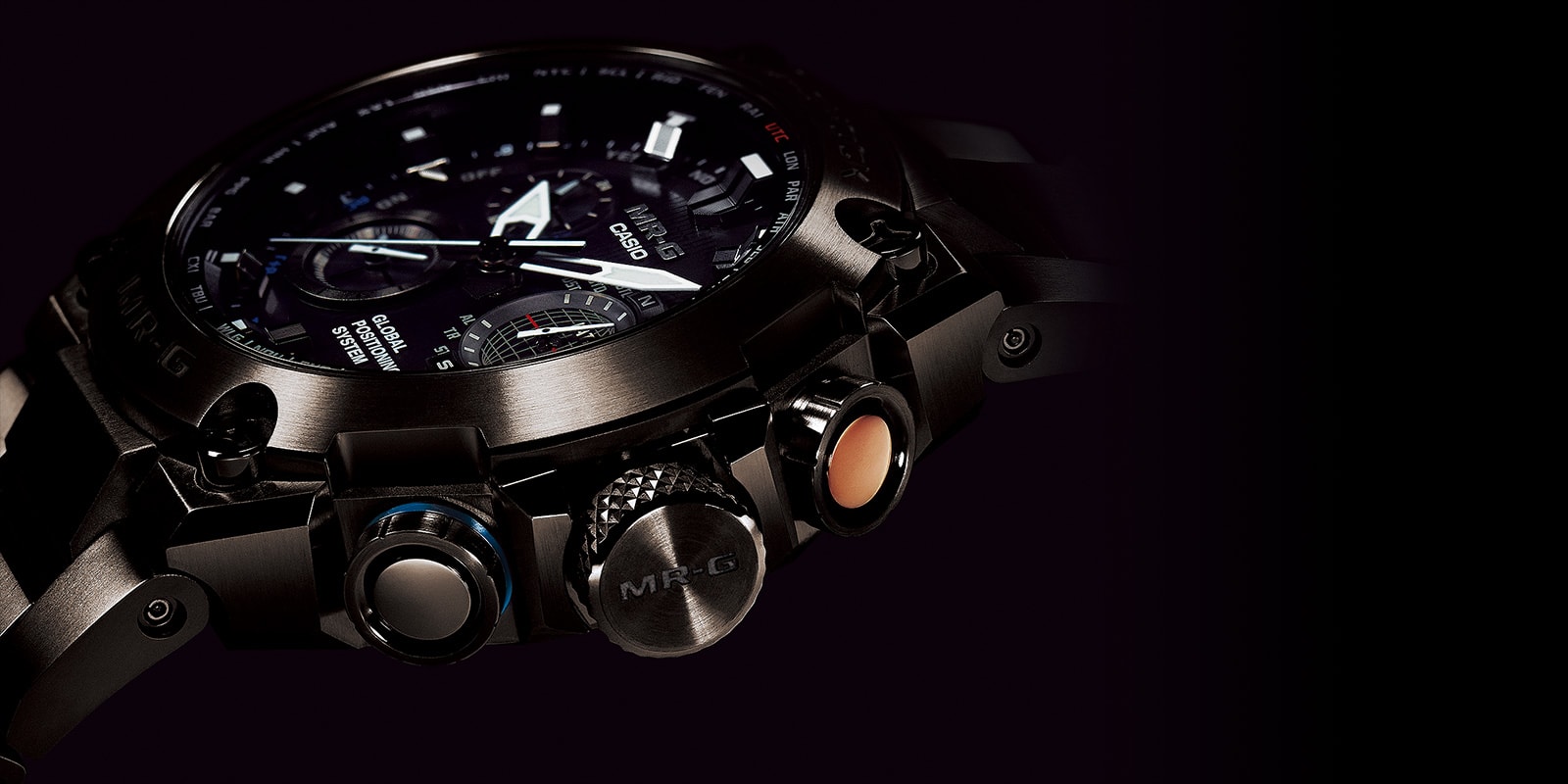 ワンプッシュの三つ折れ式中留にロック機構を装備。装着時のバンド外れを防止する。MR-Gのみに採用されている信頼性の高いバックル。