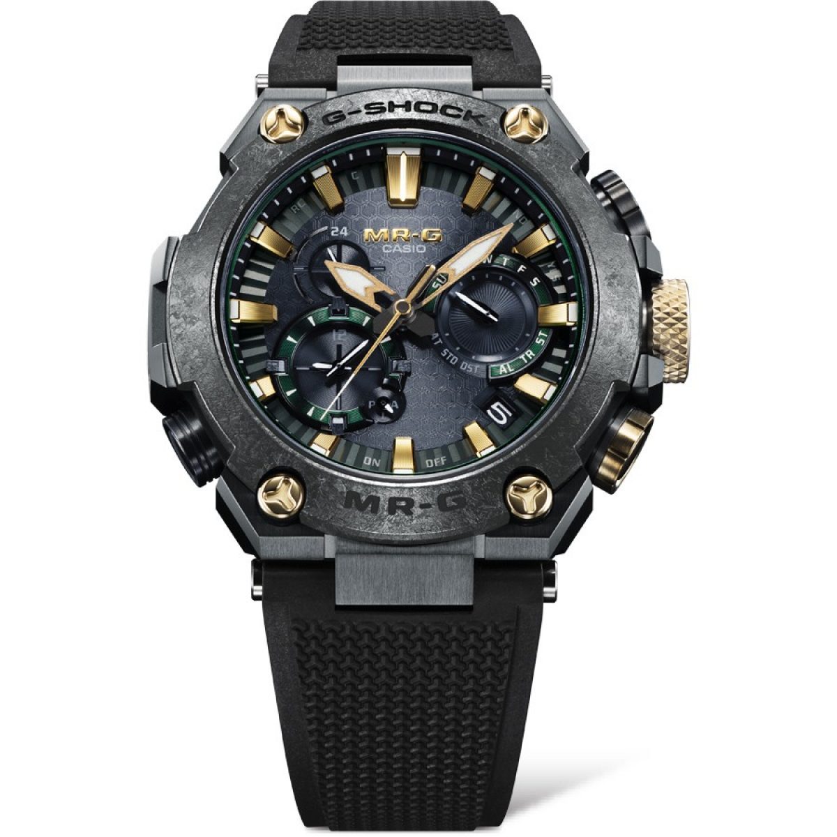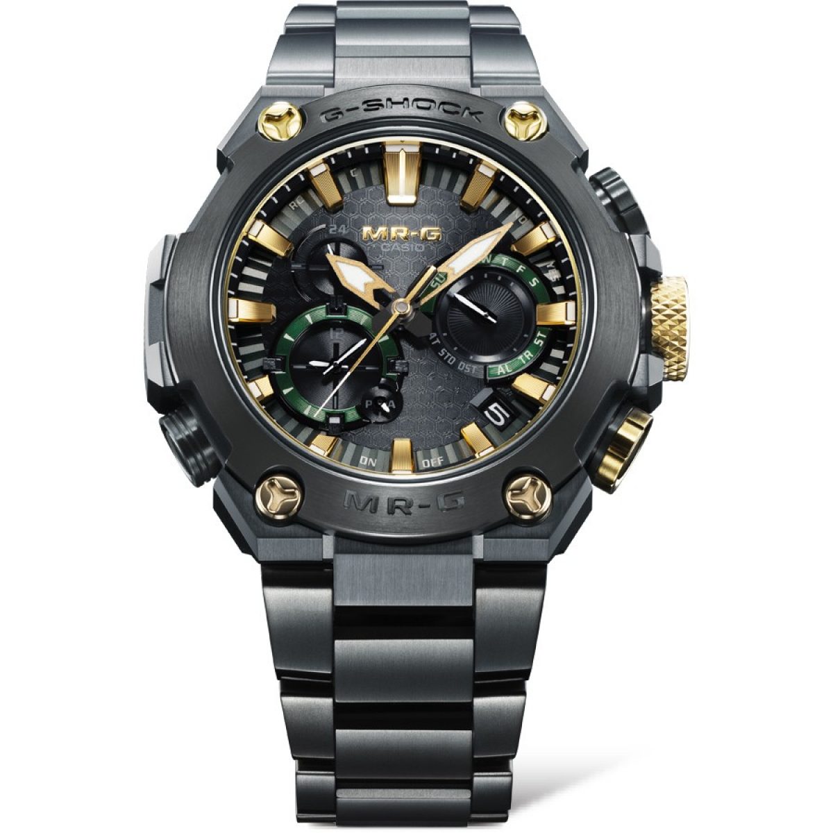 以日本传统色之一 “鐵色(くろがねいろ)” 为主题色,将自古传承的和风美学,融入MRG引以为傲的革新工艺世界观中。通过对外部钛金属部件进行深层硬化处理与绿色 DLC 镀膜,再现了铠甲用铁经高温灼烧后呈现的深邃青绿色泽。近乎纯黑的质感与富有层次的绿色格调相互调和,彰显MR-G所追求的至臻强度与美感。